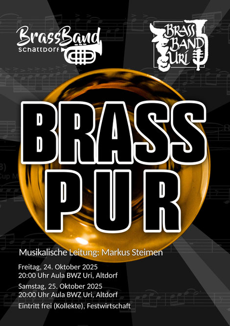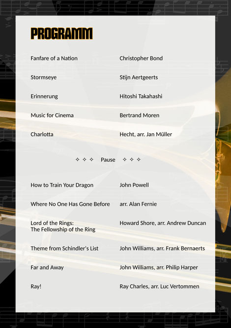Brass Band pur – modern, mitreissend und voller Überraschungen! Dies ist das Motto dieses Herbstkonzerts. Im ersten Konzertteil erleben Sie die packende Klangwelt von «Stormseye» (S. Aertgeerts), die lyrische Tiefe von «Erinnerung» (H. Takahashi), den strahlenden und majestätischen Auftritt von «Fanfare of a Nation» (C. Bond) und als Vorschau auf den zweiten Teil: «Music for Cinema» (B. Moren) ein filmreifes Sounderlebnis in mehreren Facetten.